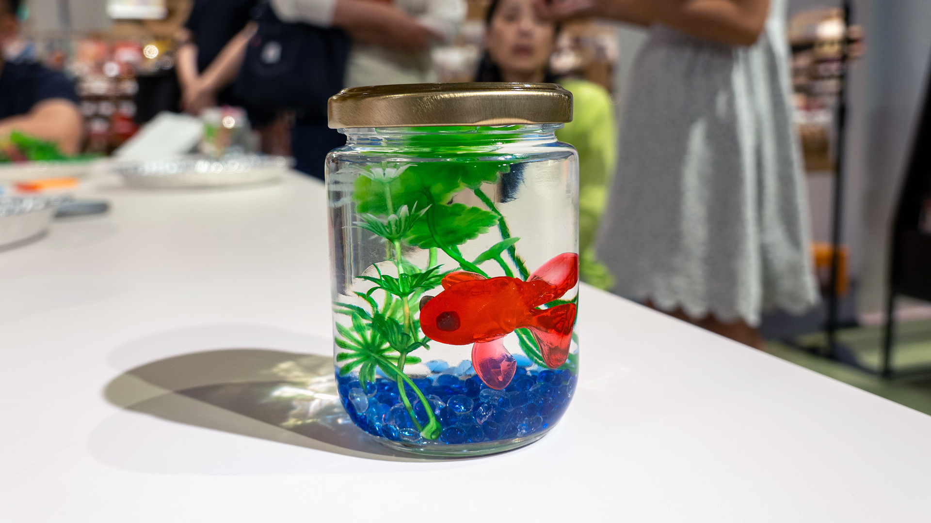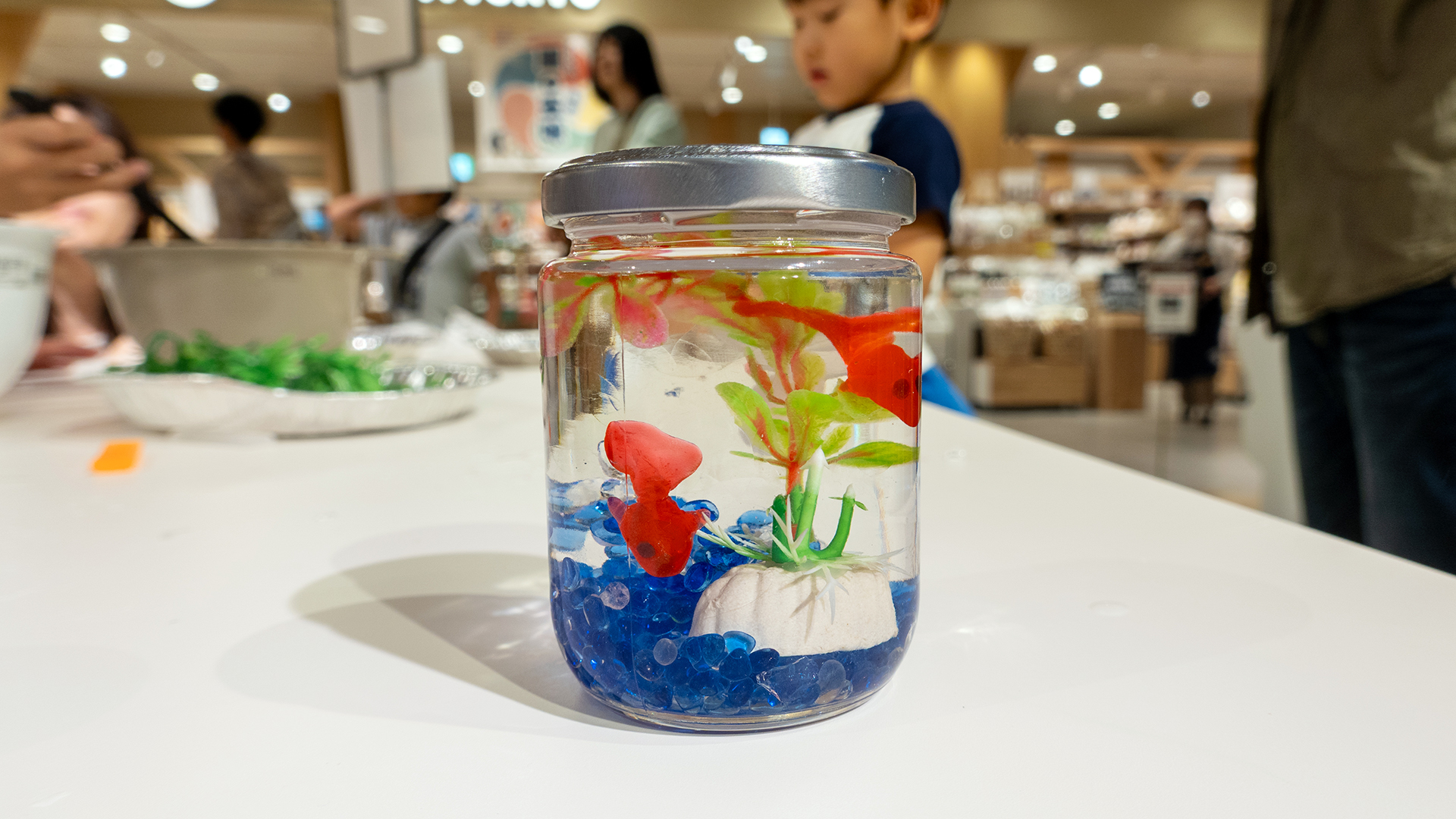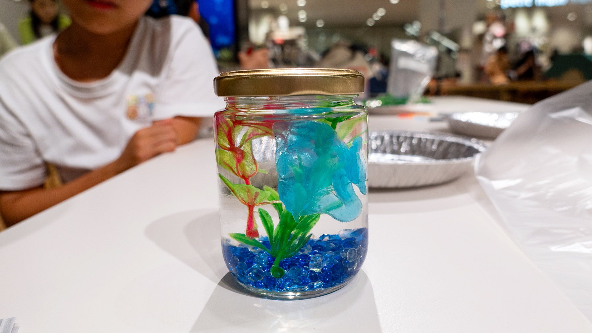 その後、オリジナルの金魚を“泳がせる”ジオラマの水槽をつくりました。子どもたちはガラス瓶の中に消臭ビーズの透明の球体をたくさんいれて、水を注ぐとあら不思議。球体の輪郭が水になじんで消えてしまいました。そして、その中に青く透き通った玉砂利を敷いて、ゆらゆら揺れる藻を挿して、最後にオリジナルの金魚を浮かべました。