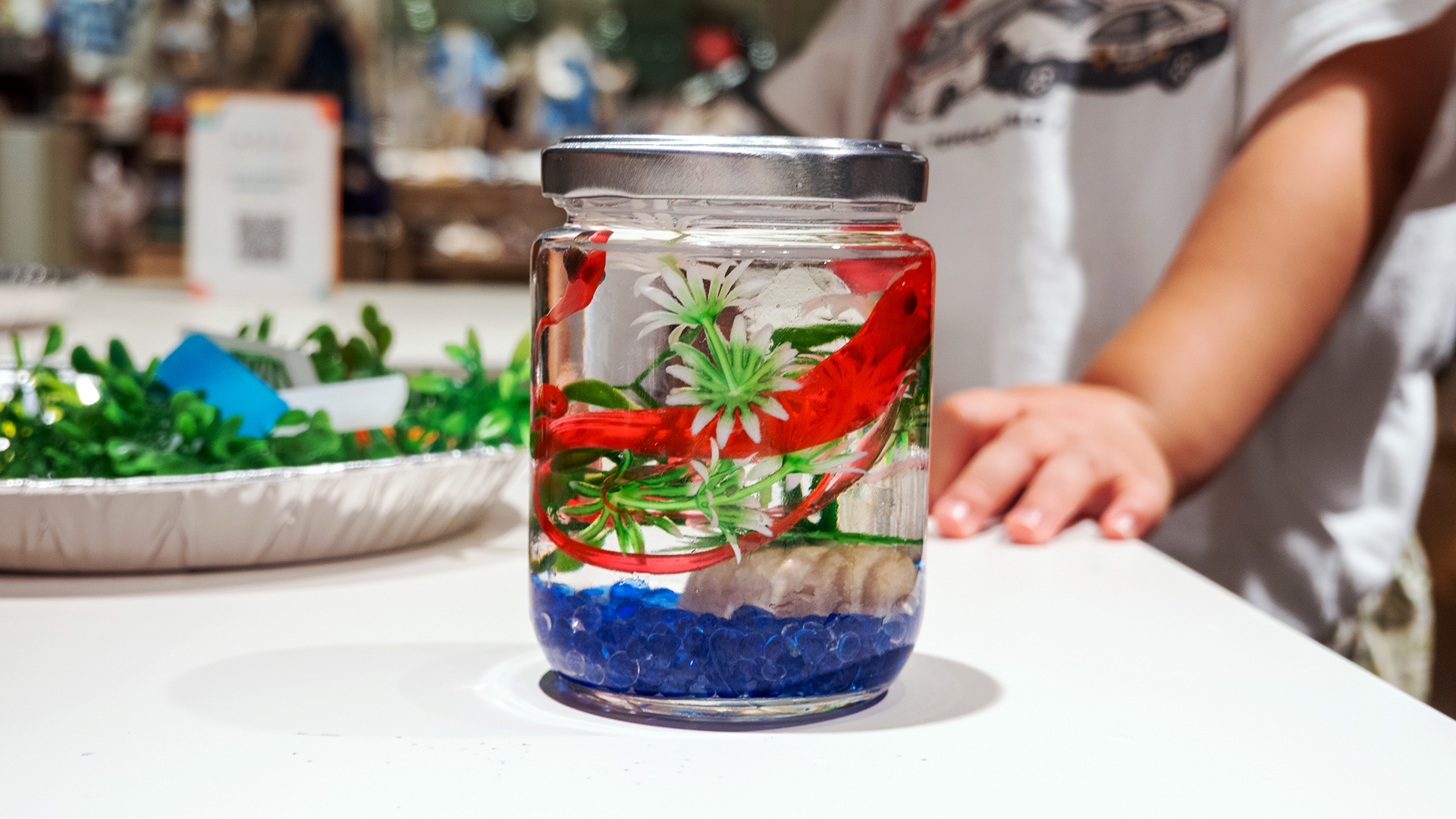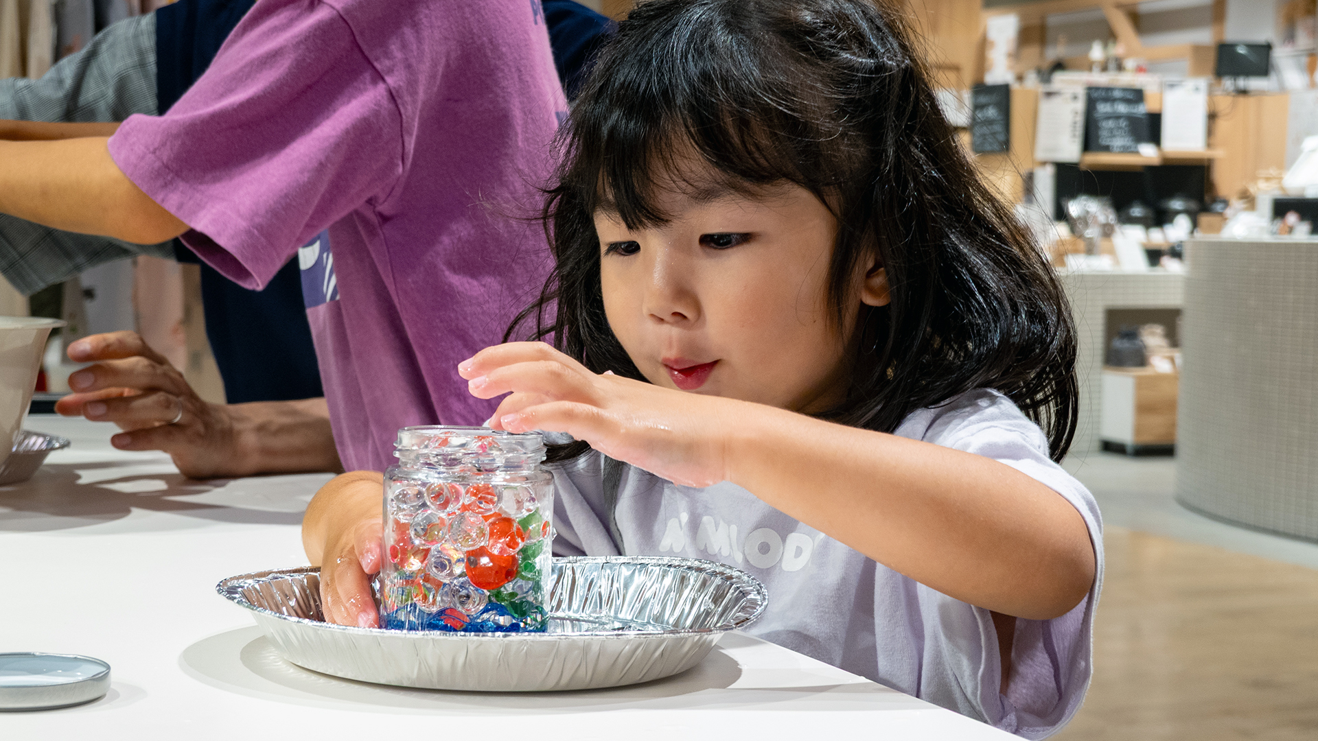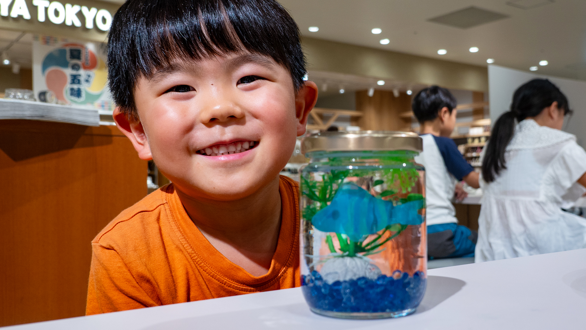 その後、オリジナルの金魚を“泳がせる”ジオラマの水槽をつくりました。子どもたちはガラス瓶の中に消臭ビーズの透明の球体をたくさんいれて、水を注ぐとあら不思議。球体の輪郭が水になじんで消えてしまいました。そして、その中に青く透き通った玉砂利を敷いて、ゆらゆら揺れる藻を挿して、最後にオリジナルの金魚を浮かべました。