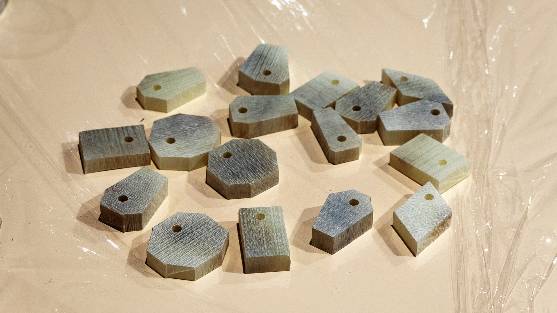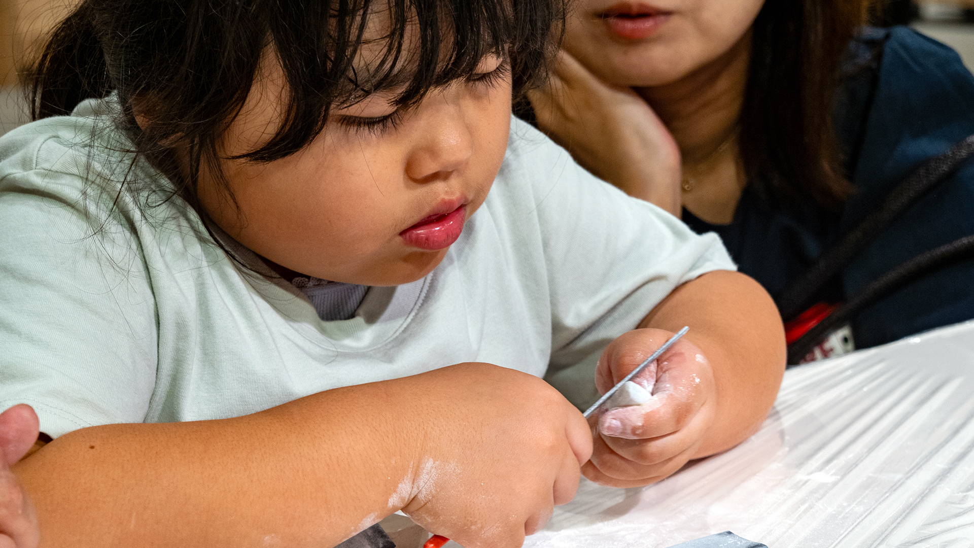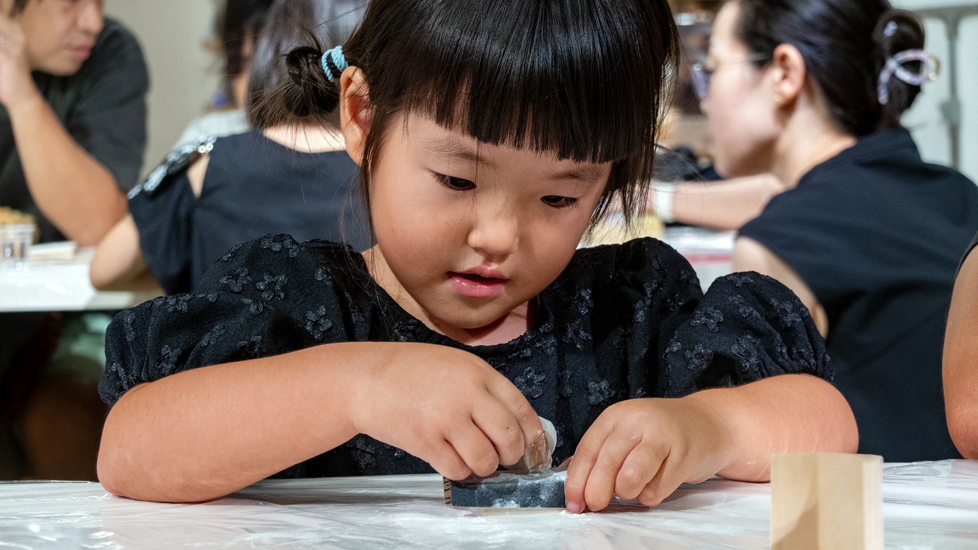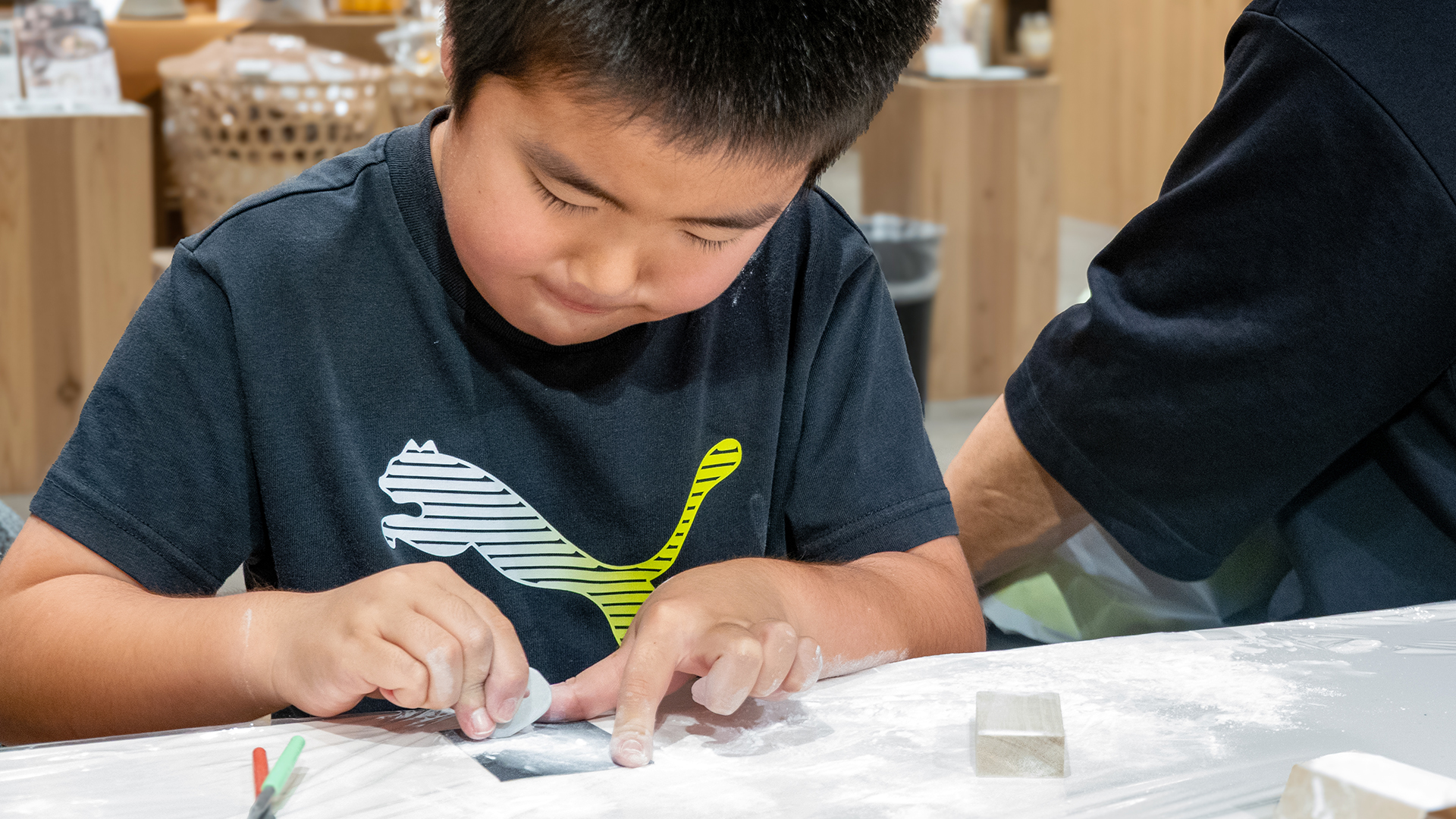 子どもたちはまず、長方形やひし形、五角形、八角形などいろんな形の中から、ひとつ石を選んで、完成形をイメージしながら、ひたすら石を磨きました。石はタルク(滑石)を使いました。白い色をした鉱物で、鉱物の硬さの基準を示す「モース硬度」は1。とっても柔らかく、削りやすい鉱物の一種です。