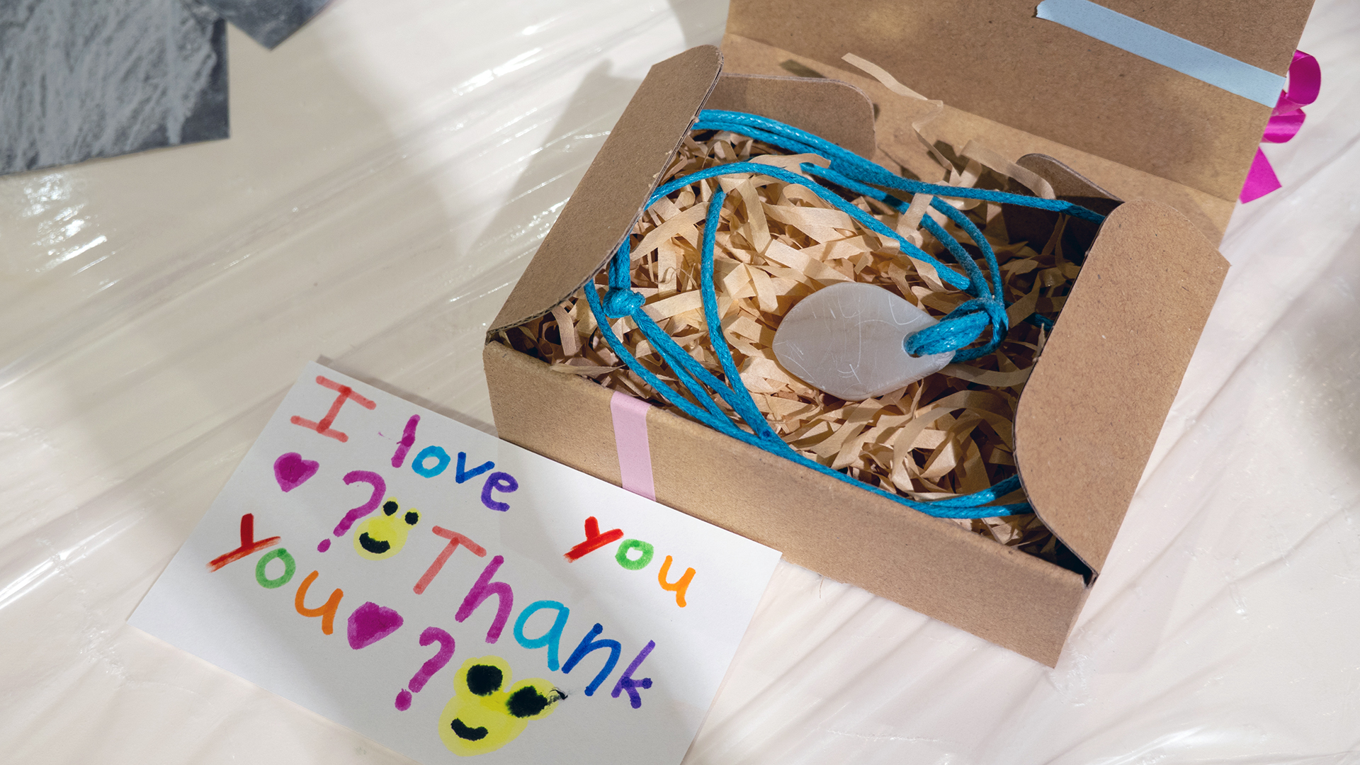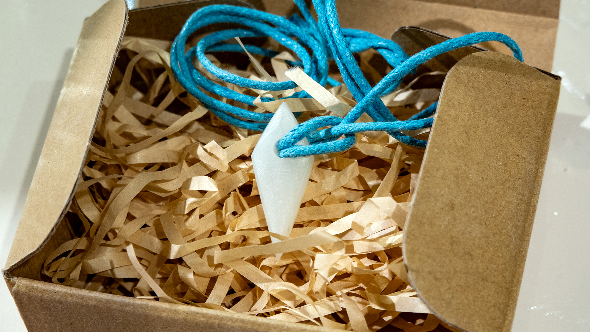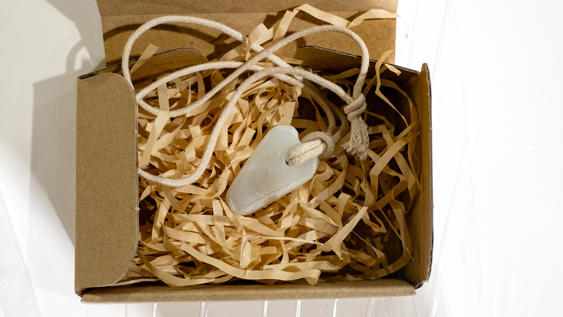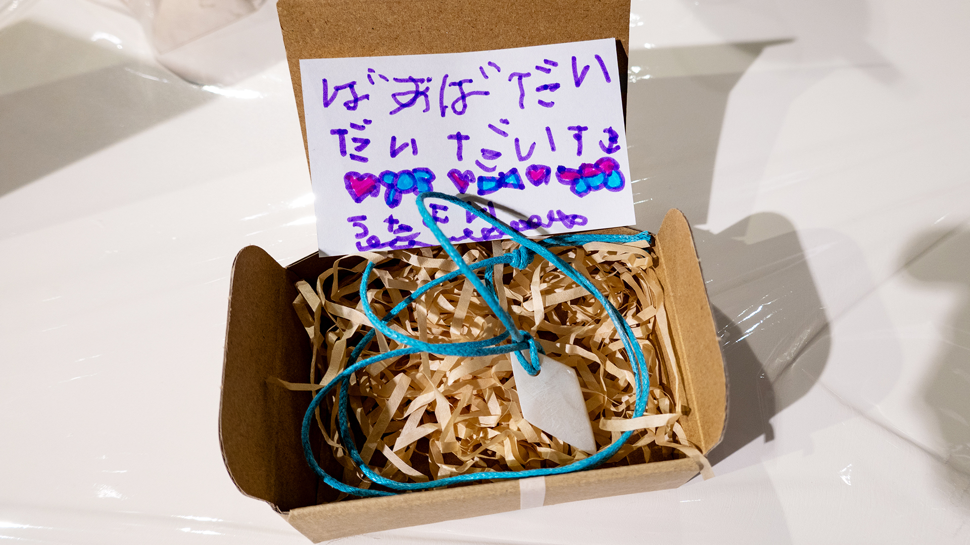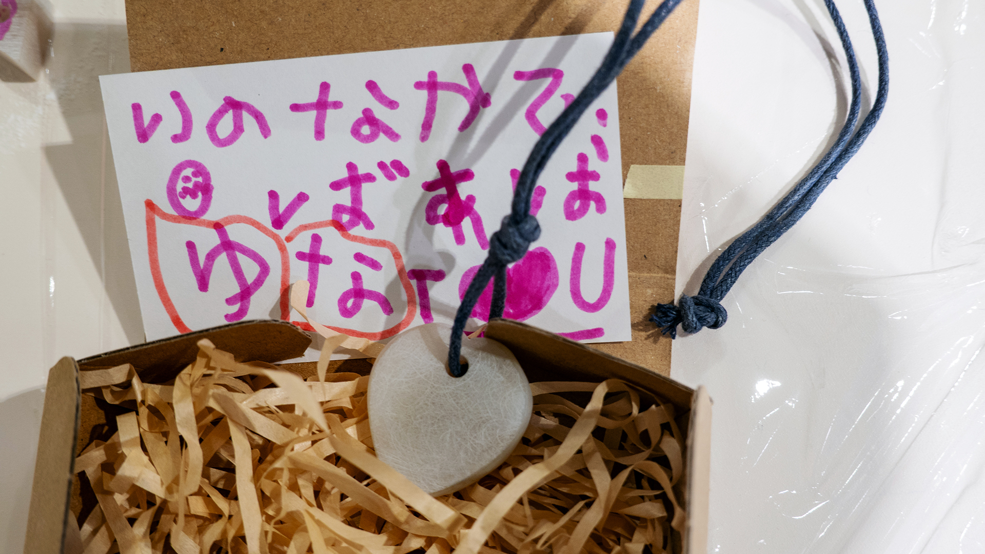 最後に、液体の研磨剤をつけた布でごしごし磨くと、真珠のような透き通った光沢をもって輝くようになりました。紐を通して首飾りにした後、満足気に自分の首にかけて持ち帰ったり、敬老の日のプレゼント用にメッセージを添えたりしました。
