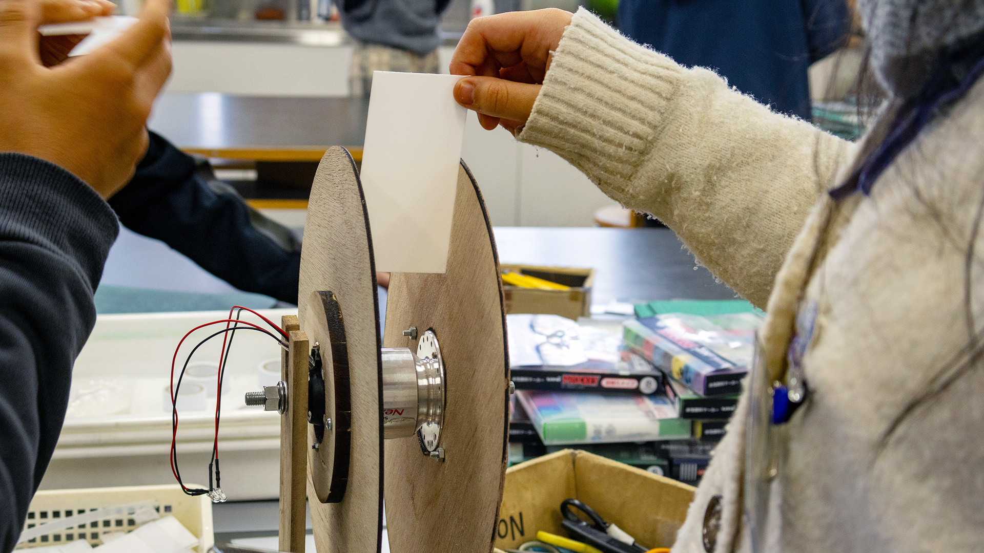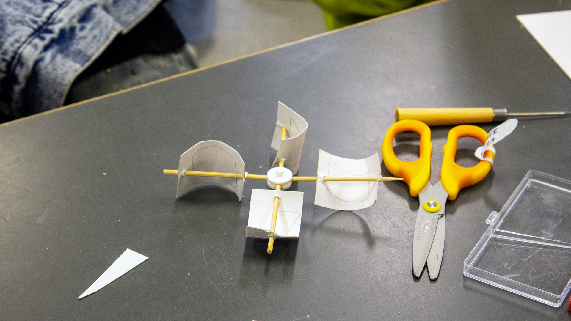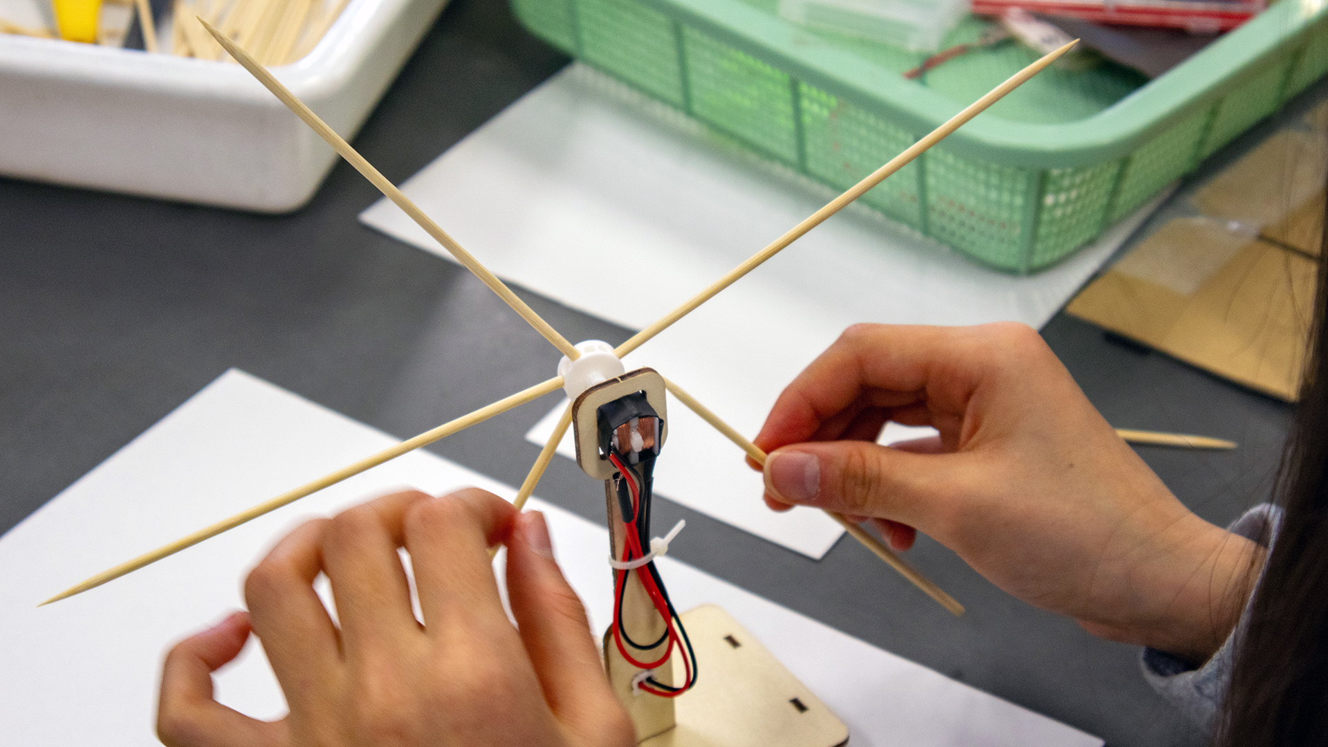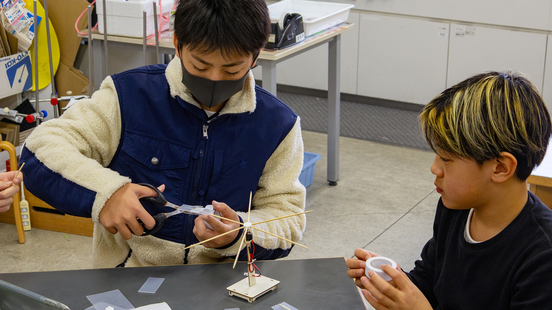 風力発電では、小型のキットを使って個人で試行錯誤しながらいろんな羽根を試し、最後にチームを代表する1台を選びました。工作用紙で作った羽根を竹串に貼り、風車のモーターに取り付けます。