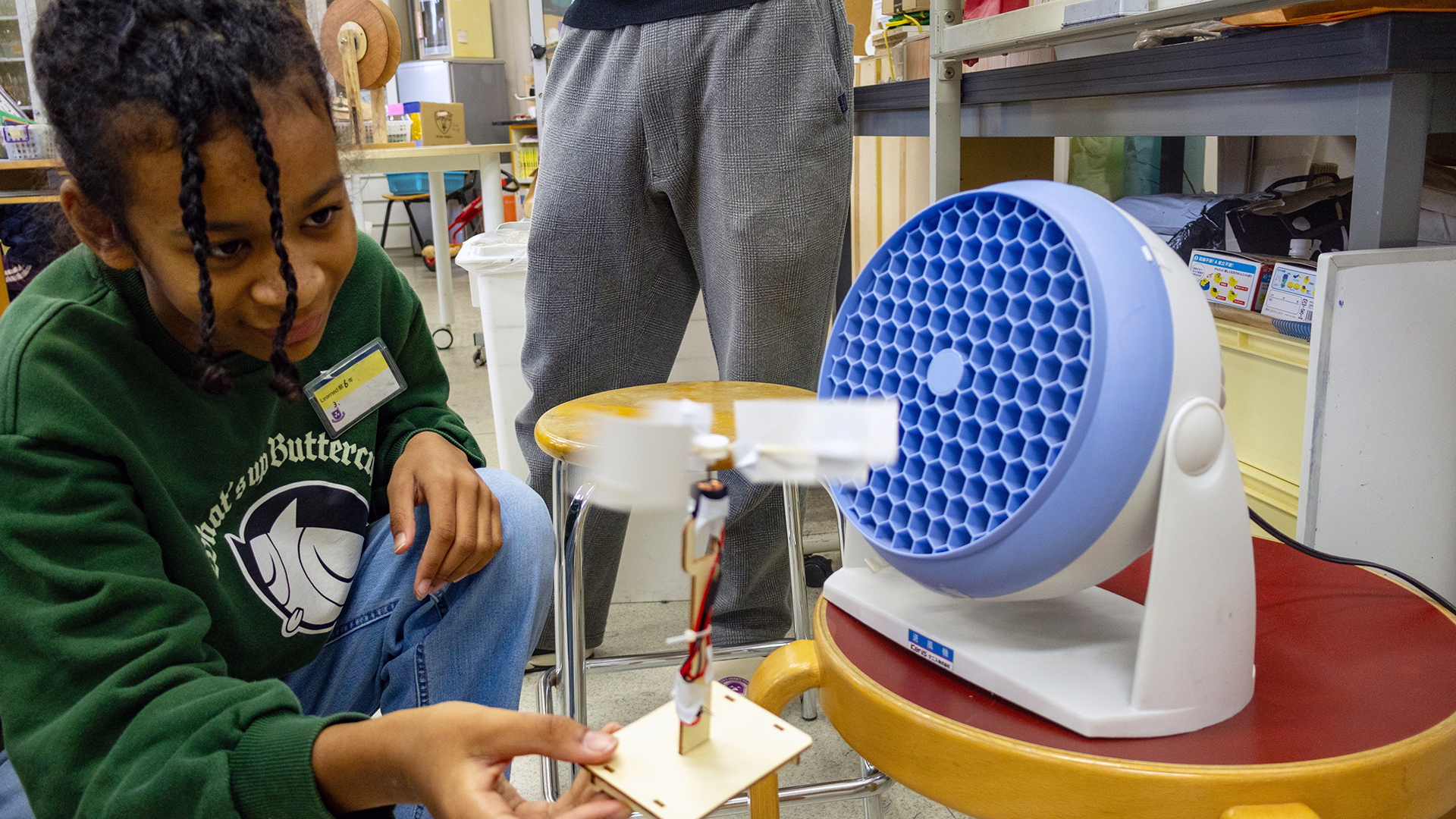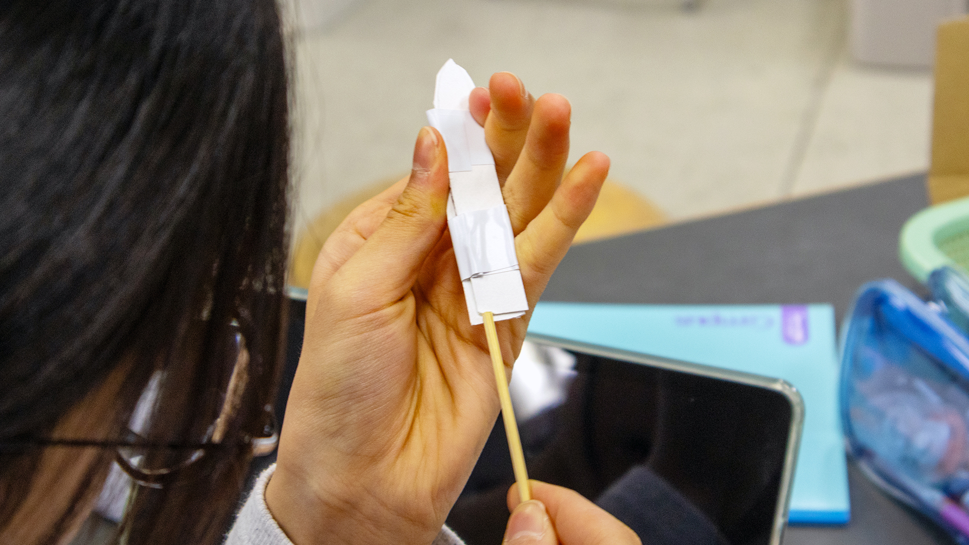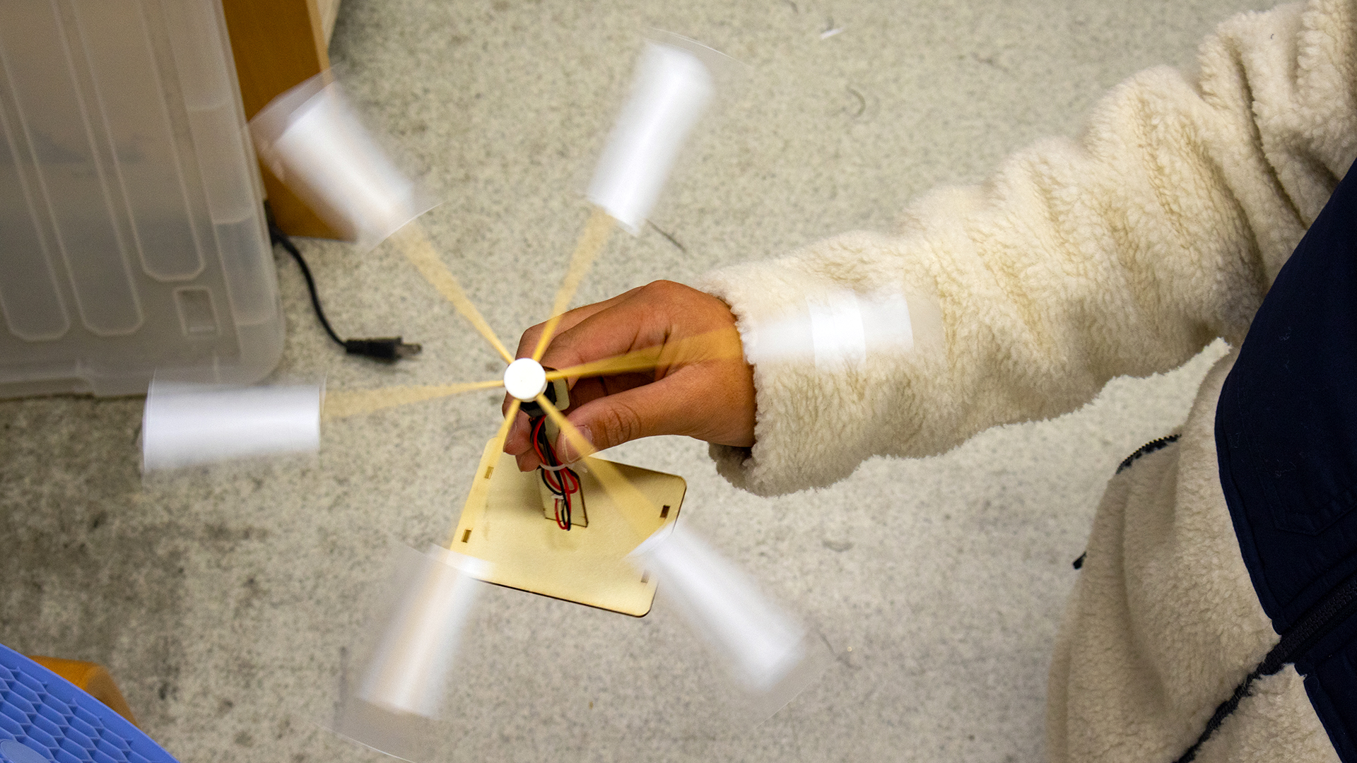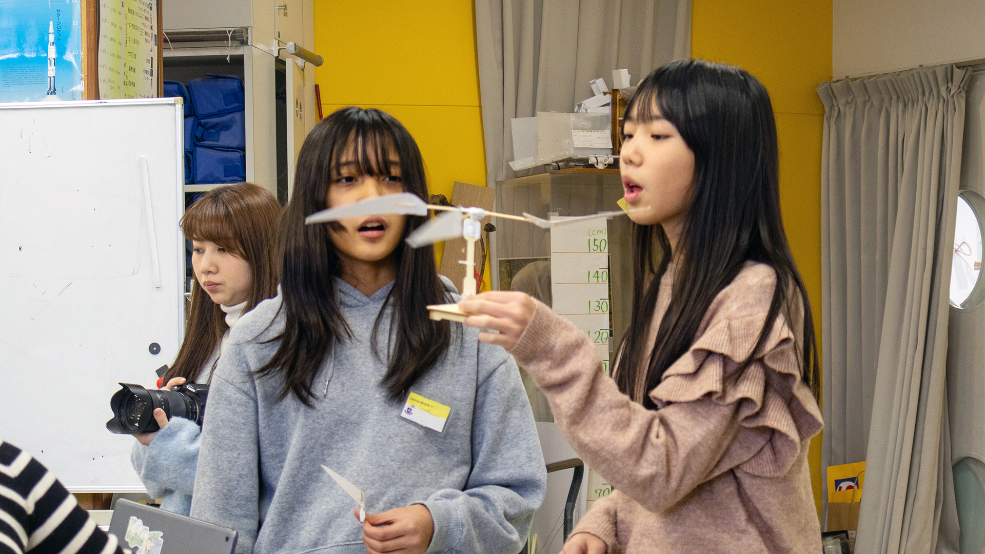 風力発電では、小型のキットを使って個人で試行錯誤しながらいろんな羽根を試し、最後にチームを代表する1台を選びました。工作用紙で作った羽根を竹串に貼り、風車のモーターに取り付けます。