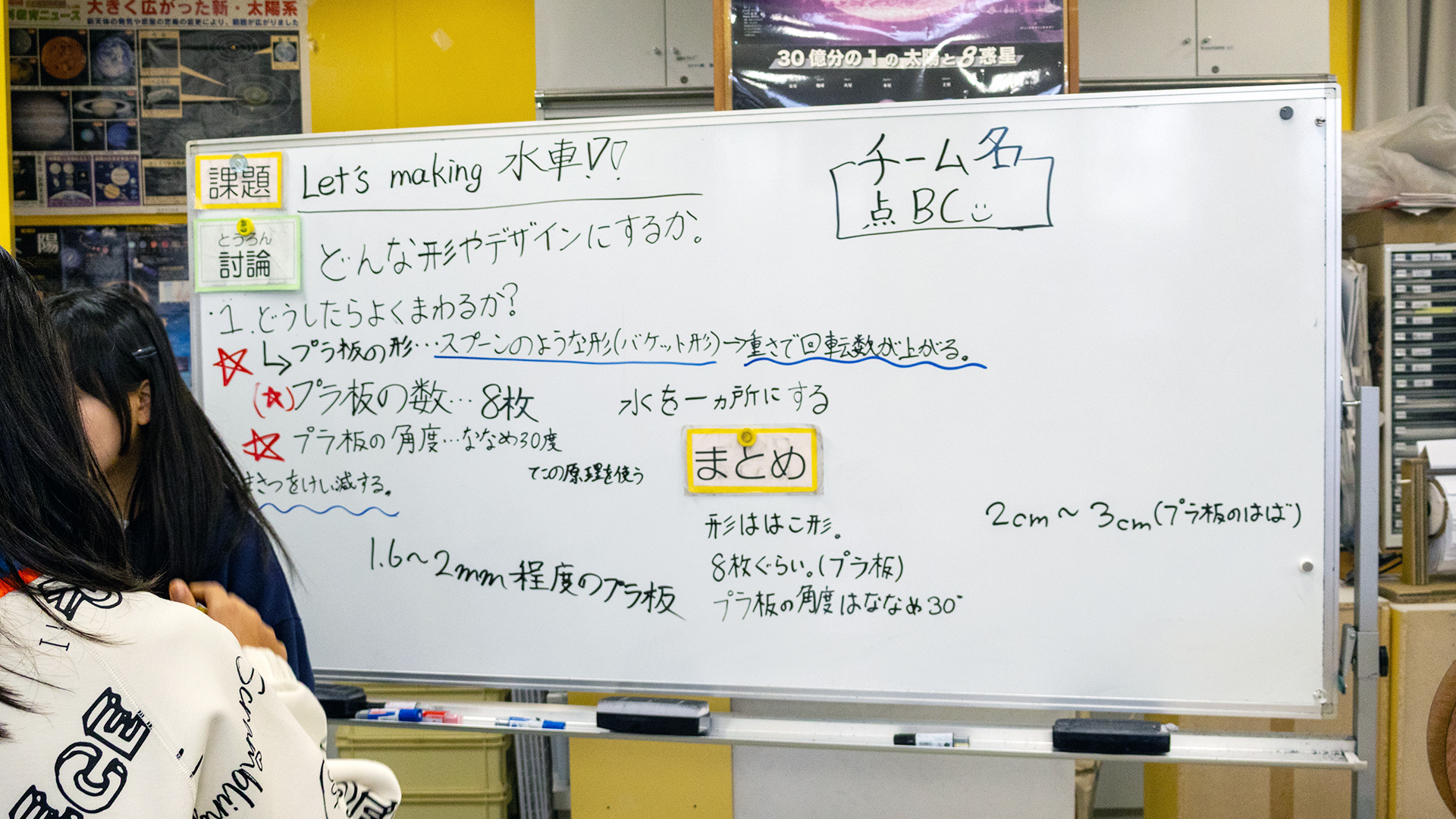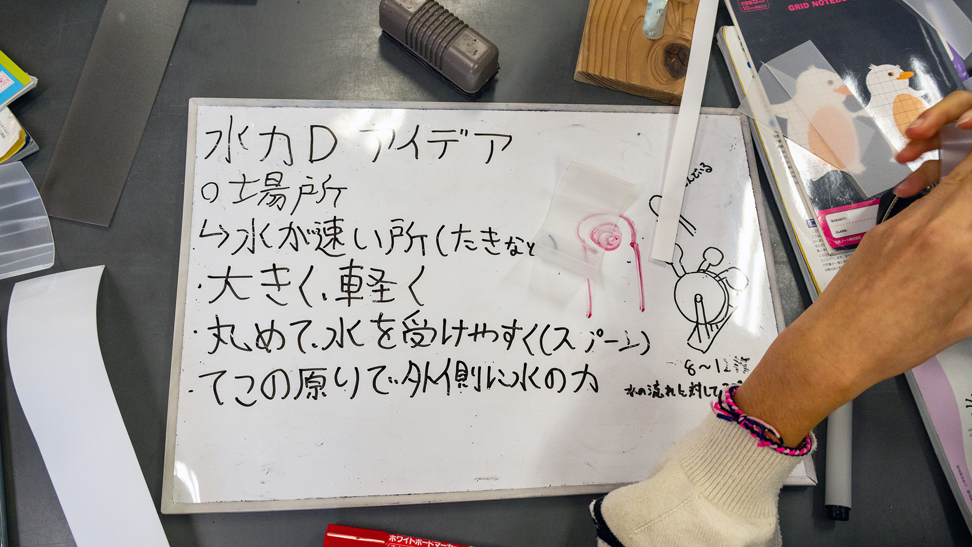 水力発電では、ホワイトボードを使ってメンバー同士でしっかり話し合ってからつくり始めるチームもあれば、手を動かして実際に羽根をつくりながら考えるチームもあり、それぞれのやり方でスタートしました。