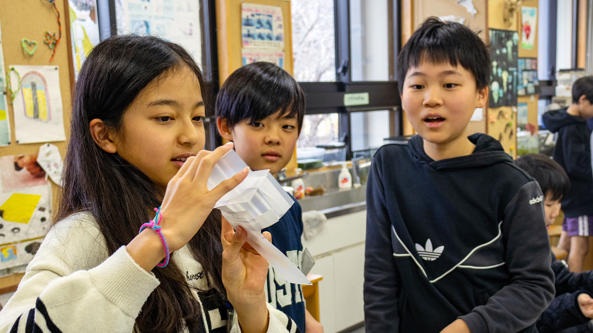 大きな羽根を広げてたくさんの風を集めようとしたり、羽根を軽くして回りやすくしようと素材を折り紙に変えたり、ヨットの帆のように羽根を曲げてカーブをつけたり、垂直に立てた軸の羽根にしてみたり、いろんな工夫をしていました。家に帰ったあとに扇風機の羽根を観察して、羽根をわずかにねじってみてくれた女の子もいました。