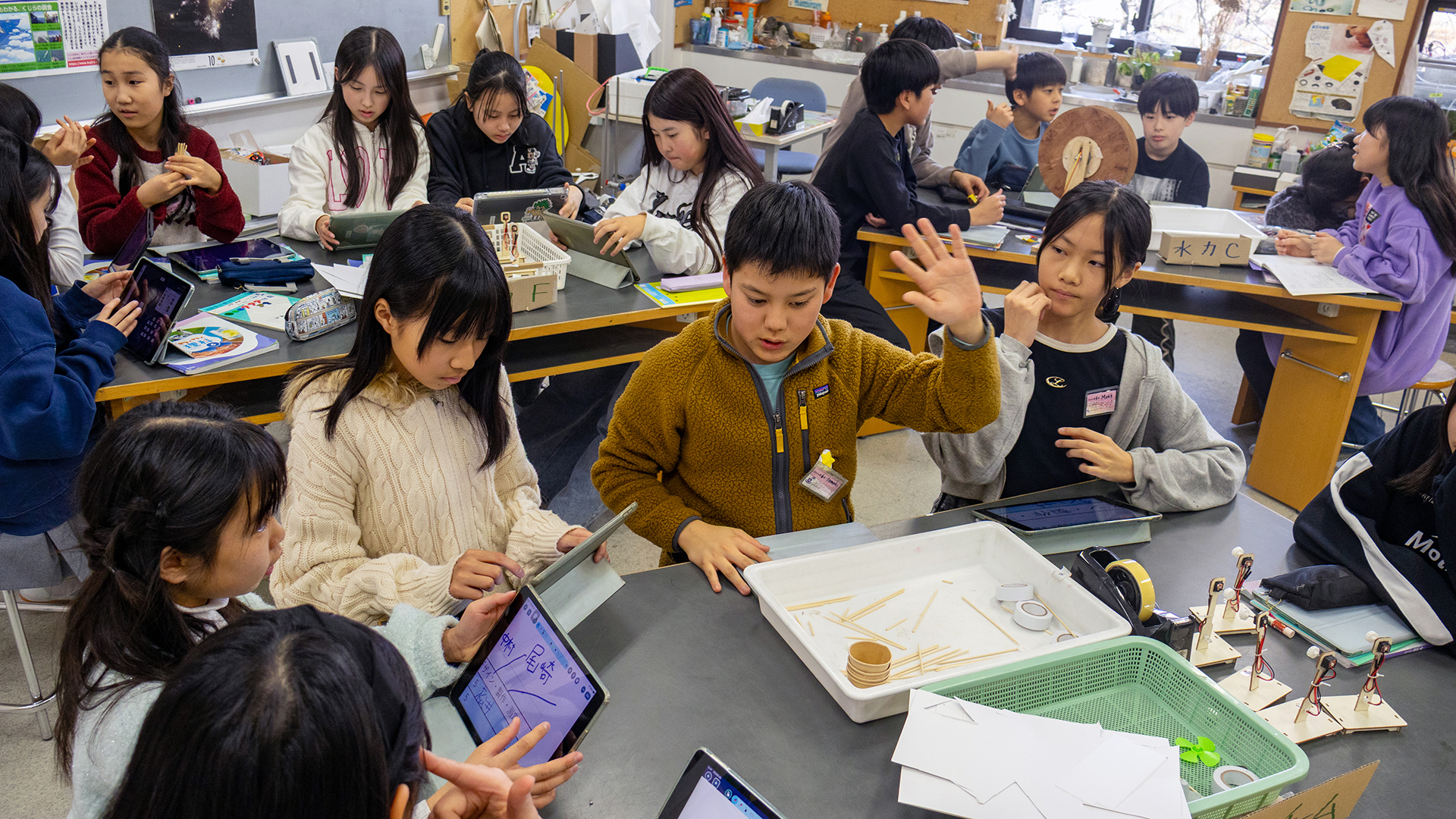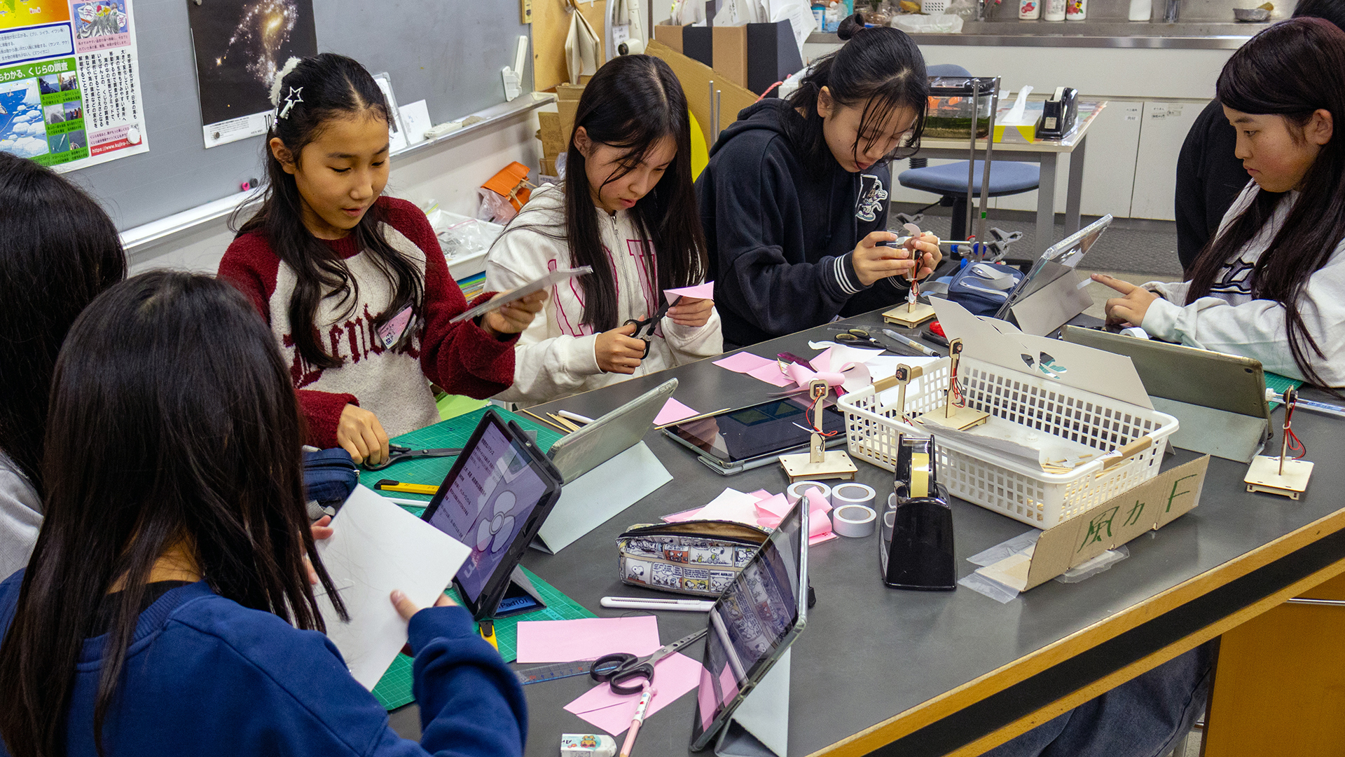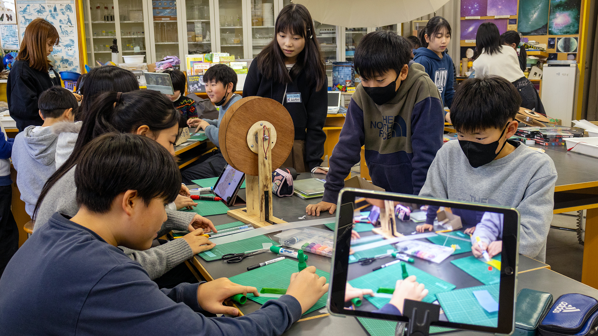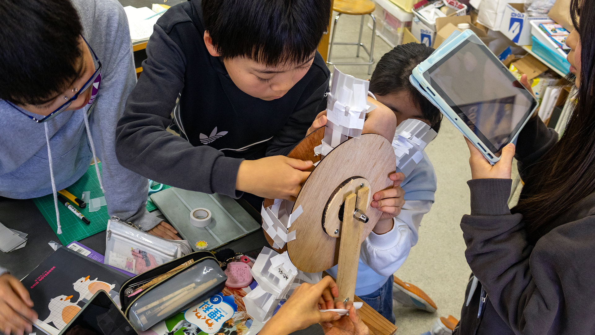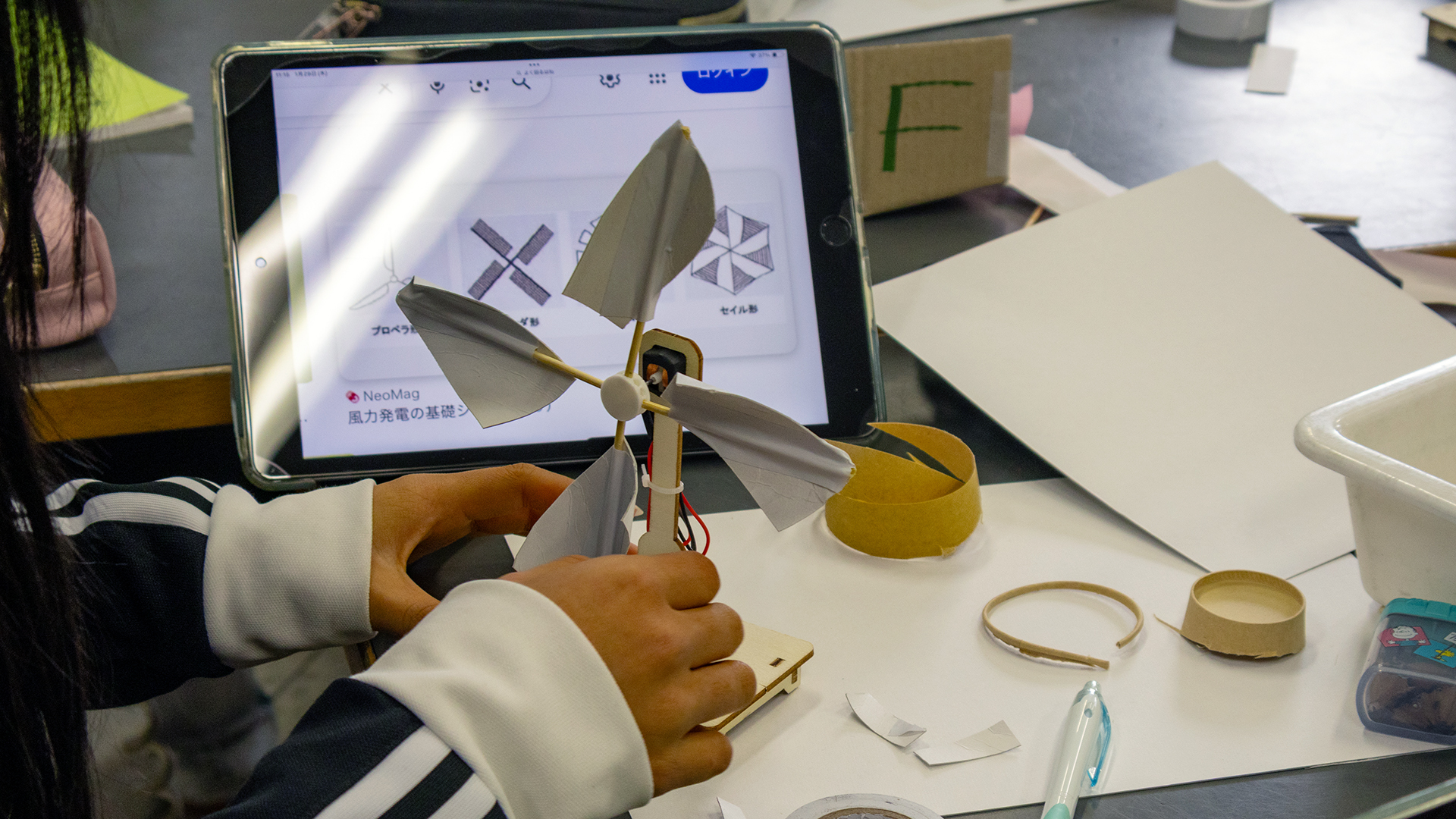外で実験して発電できているかを確かめる「実験者」、羽根を設計する「デザイナー」、設計に基づいて水車や風車をつくる「製作者」、羽根の長さや発電量などを測る「測定者」、制作や実験のようすを記録する「動画制作者」、制作過程や実験結果などを発表する「プレゼンター」。全員が何かしらの役目を担って活躍できるように、メンバーの役割を決めてから、つくりはじめました。