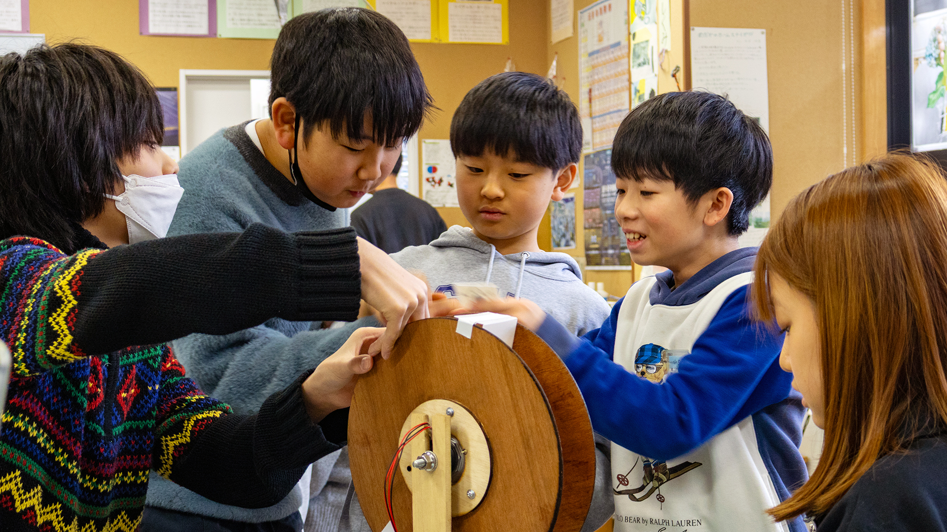 水車や風車の羽根を自由につくる実験を通じて発電のしくみを学ぶ授業を、同志社小学校と協働して実施しました。1月29日、2月4日、2月5日の3日間のプログラムに6年生3クラスの児童が参加し、学校の横を流れる岩倉川で水車を回したり、学校の屋上の風を捕まえたり、太陽の光をとらえたりして検証実験をしました。つくるまなぶ京都町家科学館が水車と風車の土台を製作しました。