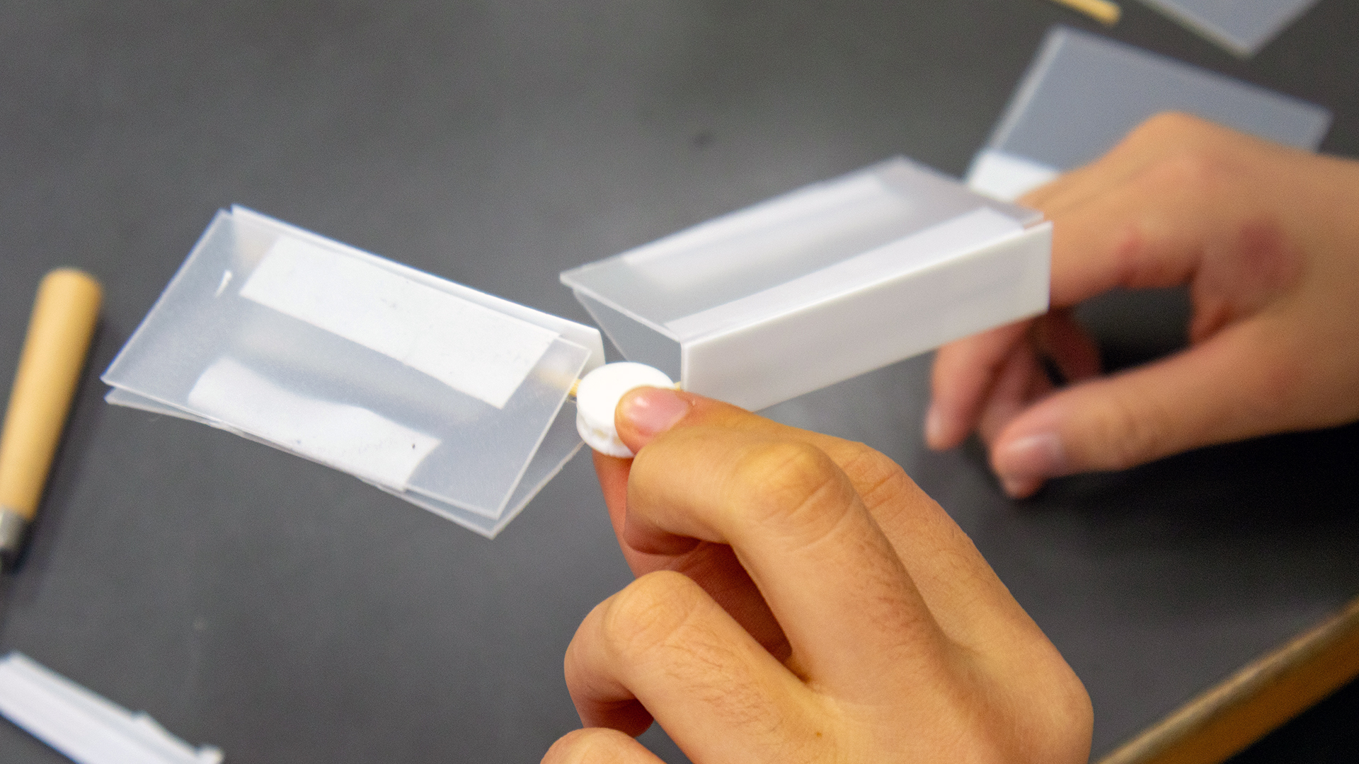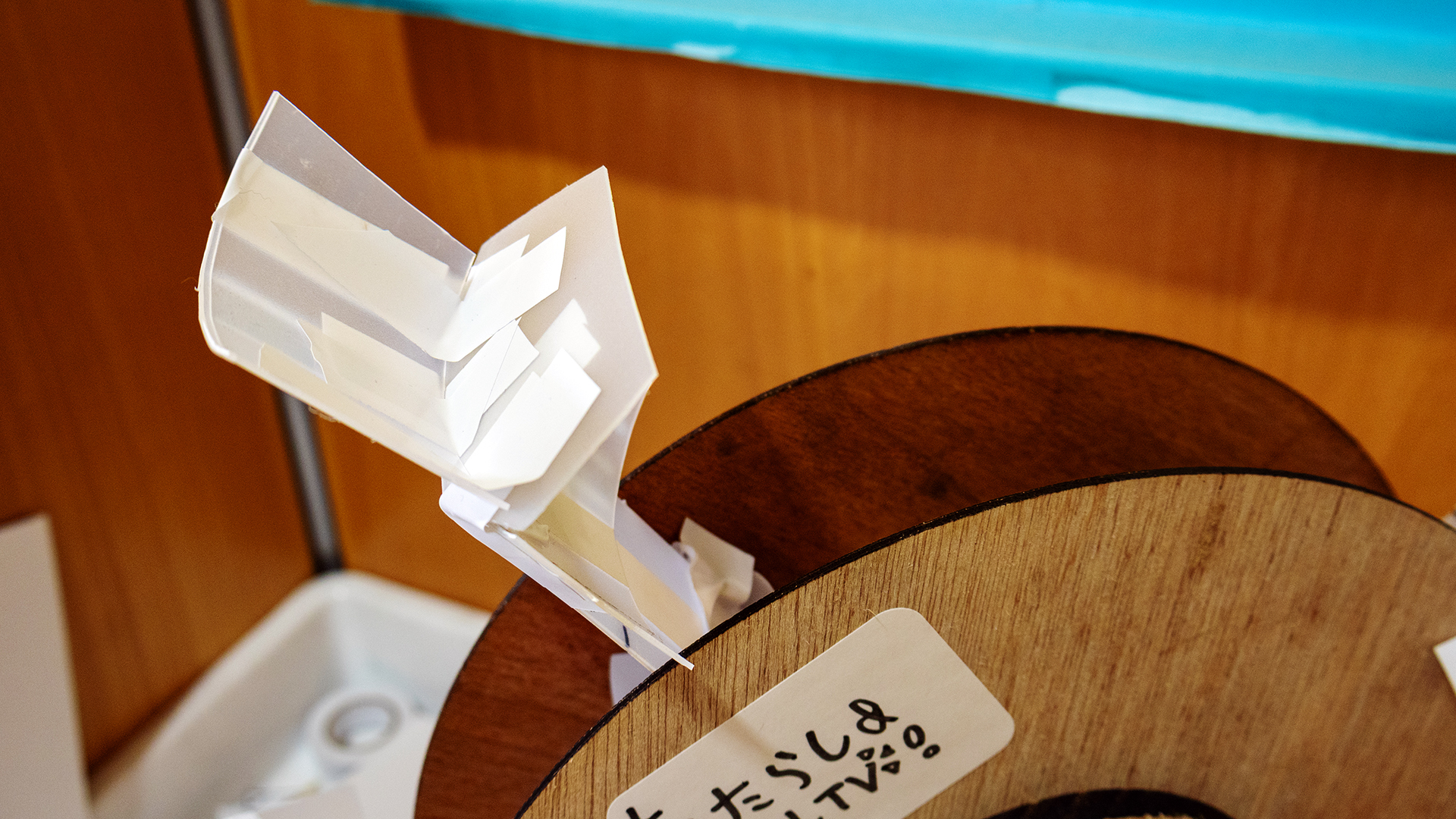 しっかり水の力を受け止めて、効率良く発電するにはどんな羽根をつけるのが良いだろう? 羽根の枚数やかたち、取り付ける角度などのアイディアを出し合い、プラスチックの板をカッターやはさみで切って、羽根をつくりました。