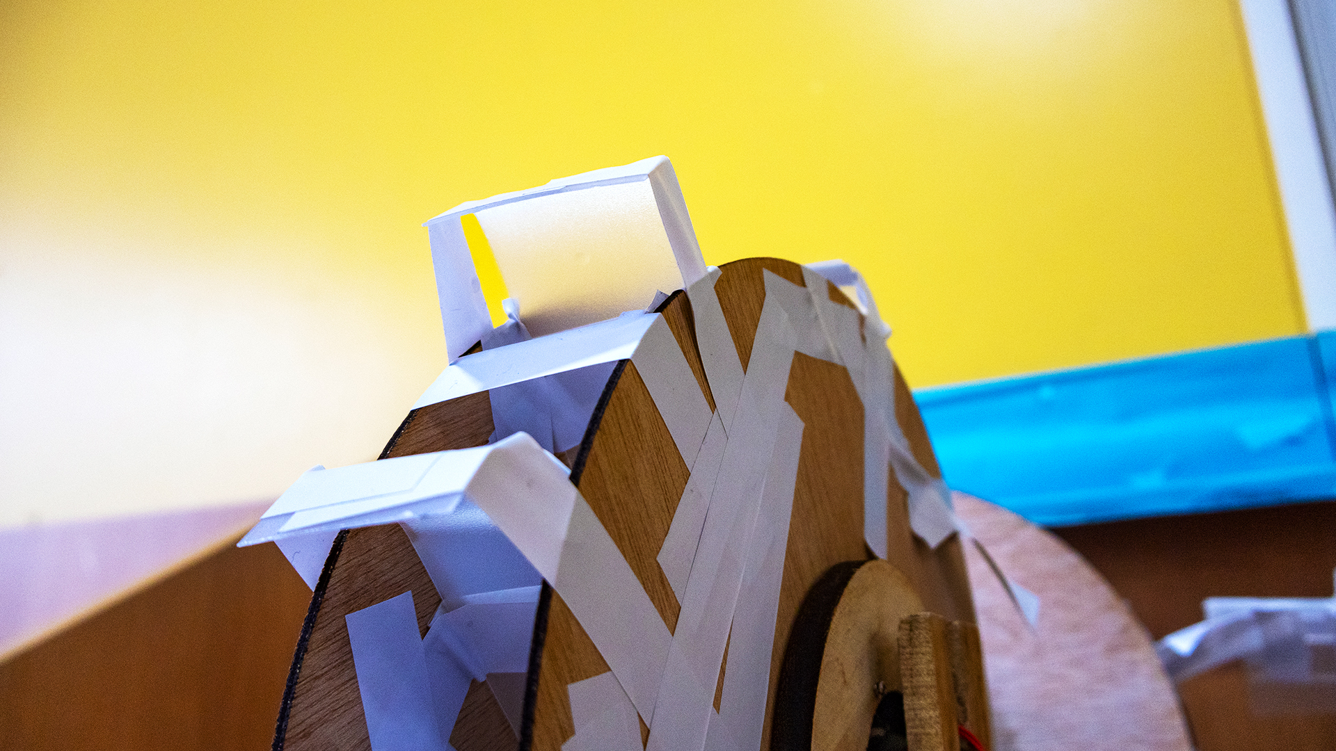 スプーンのように羽根を丸めて受け止める水の量を多くしようとしたり、水車の枠から飛び出るほどの大きな羽根を広げて回る力を強くしようとしたり、逆にコンパクトな羽根の枚数を増やして軽く回りやすい構造にしたり、羽根の取りつける強度を高めたり。チームごとにそれぞれの考え方を設計に反映して、水車をつくっていました。