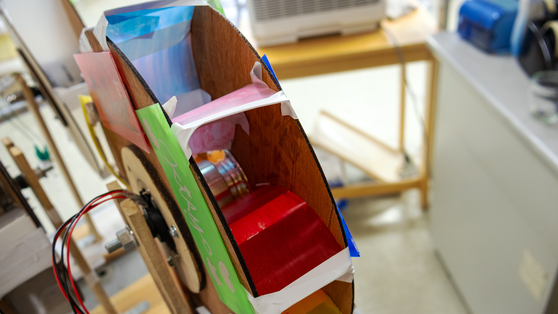 羽根ができたら、扇風機の前に持っていき、風車がどのくらい回るかを確かめました。ちょっと形が違うだけで動き方が変わるので、繊細な調整を繰り返していました。